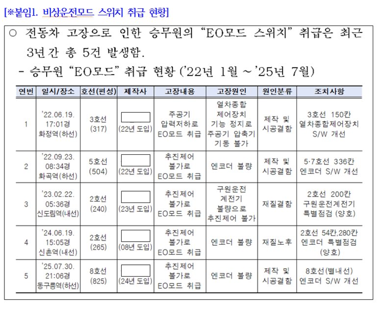 실제 사례를 보면, 2022년 6월 3호선 화정역에서는 주공기 압축기 고장으로 EO모드가 작동했고, 같은 해 9월 5호선 화곡역에서는 추진제어 불능 문제가 발생했다. 이어 2023년 2월 2호선 신도림역에서는 구원운전 계전기 불량, 2024년 6월 2호선 신촌역에서는 부품 노후화, 2025년 7월 8호선 동구릉역에서는 추진제어 불능이 원인으로 각각 EO모드 취급이 보고됐다. [※붙임1]