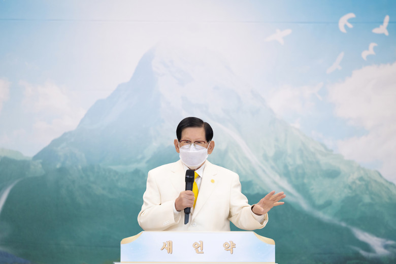 이만희 총회장은 12일 진행된 창립기념 예배를 통해 성경의 예언대로 창조된 신천지예수교회의 역사와 증거 하는 요한계시록의 실체를 확인해 줄 것을 요청하고 성도들에게는 걸어 다니는 성경책이 될 것을 당부했다.
