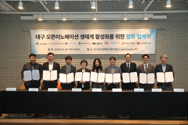 ▸ 실증자금 4천만 원 지원·대기업 인프라 개방… ‘상생 생태계’ 구축 [세계타임즈=대구 한윤석 기자] 대구광역시와 대구창조경제혁신센터는 2월 26일(목) 대구센터 2층에서 ‘대구 스타트업 오픈이노베이션 지원사업’ 공동 운영을 위한 업무협약(MoU)을 체결했다.