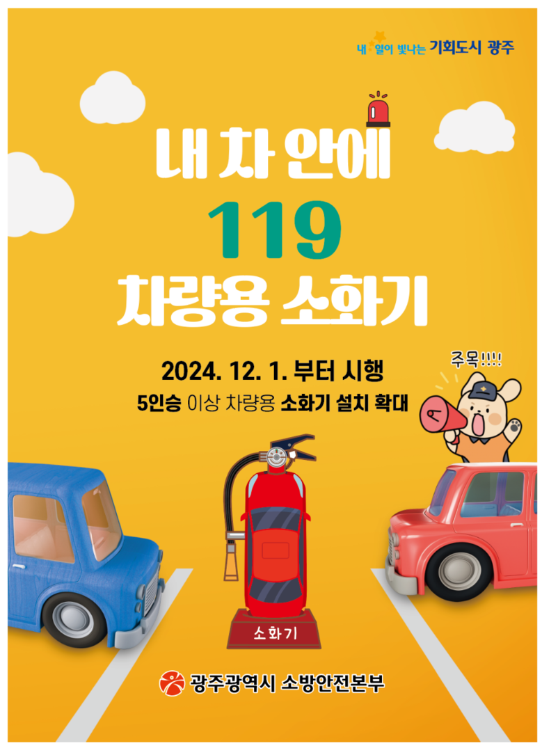 김문용 광주소방안전본부장은 “차량용소화기는 자동차 화재의 신속한 진압으로 시민의 소중한 인명과 재산을 지킬 수 있다”며 “개정 법령 시행으로 보다 안전한 자동차 환경이 조성되길 기대한다”고 말했다.