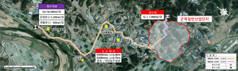 용수공급시설 사업은 함안 군북일반산업단지 인근 남강에서 하천수를 취수(Q=16,300㎥/일)하여 도수관로(L=5.1km)를 통해 산업단지에 원수를 공급하고, 정수장에서 수질을 개선해 양질의 용수를 입주 기업 등에 제공하는 사업이다.