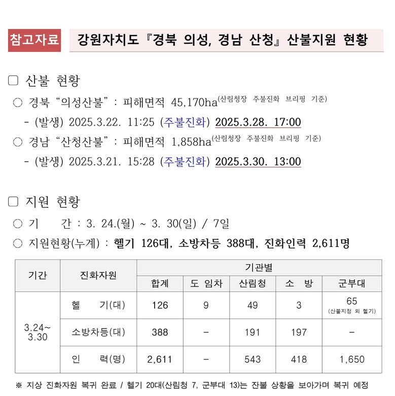 - 도가 지원한 산불 진화 규모는 누적 기준으로 헬기 126대(도 임차 9, 산림청 49, 군부대 65), 소방차 등 진화 장비 388대, 인력 2,611명이다.