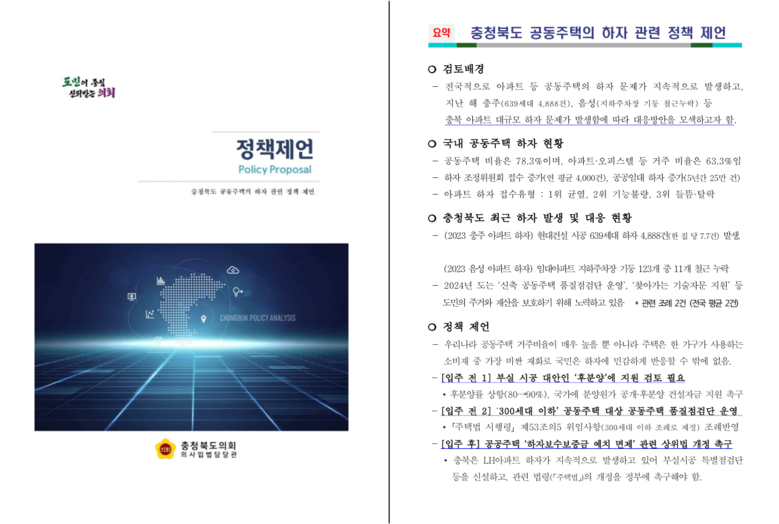 ‘정책제언’은 의원들의 의정활동을 신속하고 전문적으로 지원하기 위해 의회에서 발간하는 연구보고서로 국내외 입법 현황, 충북을 포함한 타 시·도 조례 검토와 이에 따른 정책 개선 및 입법 방향 등을 담고 있다.