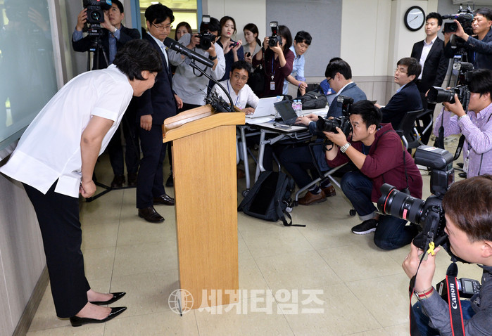 바른정당 이혜훈 대표가 31일 오후 경기 파주시 홍원연수원에서 금품수수 논란 해명 기자회견을 마치고 인사를 하고 있다. 이혜훈 대표는 사업가 A씨로부터 수천만원 대의 금품을 수수했다는 의혹에 대해 돈을 빌렸지만 모두 갚았다고 밝혔다. 2017.08.31.