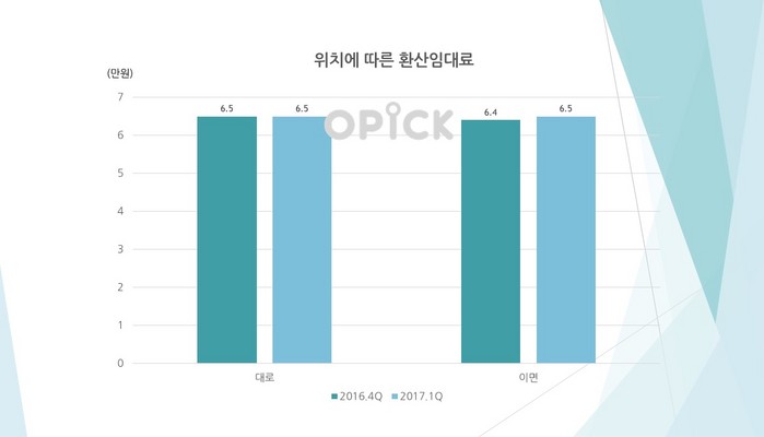 대로변과 이면도로에 따른 차이는 없었다. 두 조건 모두 동일하게 6만5000원 환산임대료를 보여 평균적으로 대로변의 건물이 더 비쌀 것이라는 예측을 빗나갔다.