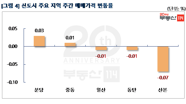 신도시는 ▼산본(-0.08%) ▼동탄(-0.04%) ▼일산(-0.03%) ▼분당(-0.01%) 순으로 떨어졌다. 산본은 송정지구 2,000여 가구 입주가 전 지역에 영향을 미치면서 산본동 한라주공4단지가 500만원 하락했다. 동탄은 능동 푸른마을포스코더샵2차가 1,500만원 내렸고, 일산은 주엽동 문촌16단지뉴삼익, 강선14단지두산이 각각 500만원씩 떨어졌다. 분당은 비수기를 맞아 거래가 정체되면서 서현동 시범한양과 효자임광이 250만원-1,000만원 하락했다. 반면 △평촌(0.03%) △광교(0.02%)는 올랐다.
