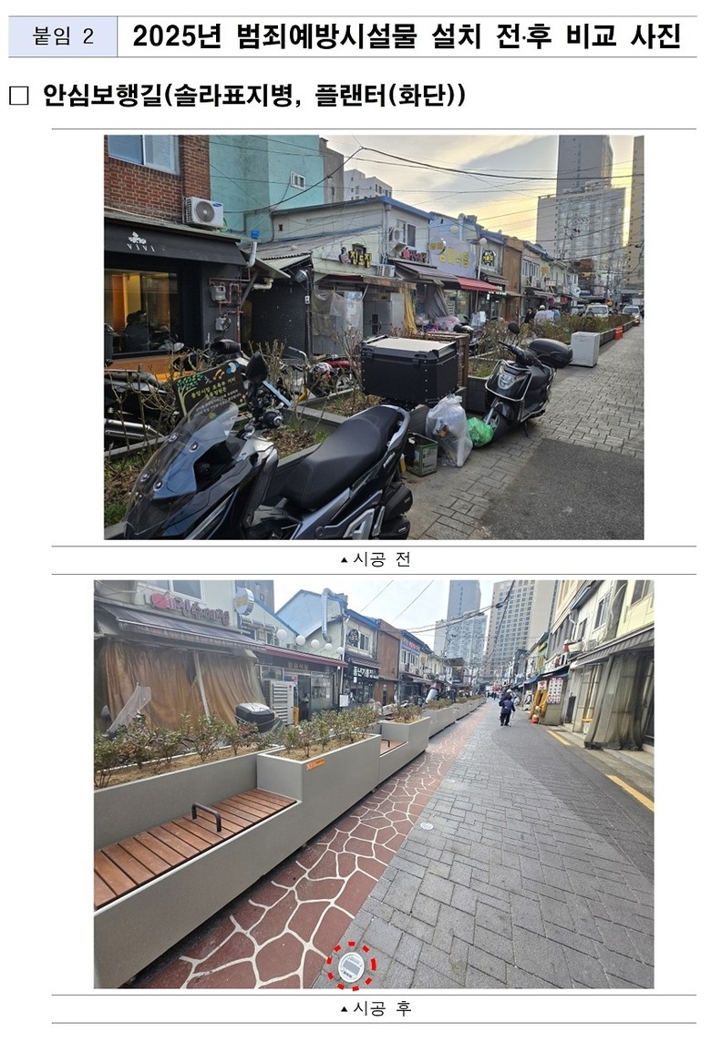 특히, 올해는 사업의 체감 효과를 높이기 위해 대상지 선정 및 설계 방식을 개선했다. 서울시(공간정보과)에서 운영하는「S-Map 방범취약지역 분석서비스」*를 활용해 데이터 기반 선정의 객관성을 확보하고, 대상지 내 ‘집중개선구역’을 별도로 지정해 예산을 집중 투입함으로써 주민이 체감할 수 있는 가시적 환경개선을 추진할 계획이다.
