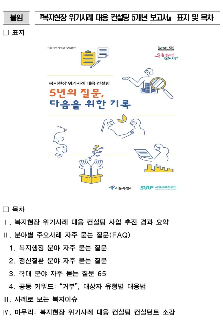 『복지현장 위기사례 대응 컨설팅 5개년 보고서』는 공유복지플랫폼(wish.welfare.seoul.kr)에서 내려받을 수 있으며, 컨설팅 신청 또한 동일한 플랫폼에서 가능하다.