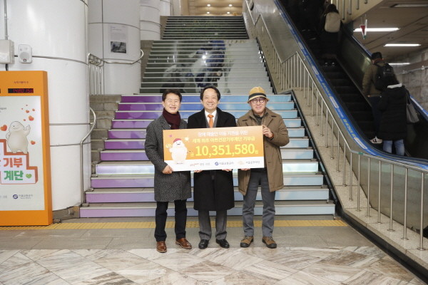 기부금 전달식은 지난 9일 서울시 지하철 7호선 강남구청역 ‘아트건강기부계단’ 앞에서 열렸다. 전달식에는 365mc 네트웍스 김남철 대표이사, 서울교통공사 서완석 미디어실장, 서울문화재단 김종휘 대표가 참석했다.