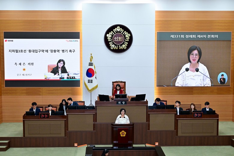 [서울 세계타임즈=이장성 기자] 서울특별시의회 주택공간위원회 옥재은 의원(중구2, 국민의힘)은 6월 27일(금) 제331회 정례회 본회의 5분 자유발언에서 지하철 3호선 ‘동대입구역’의 역명에 ‘장충역’을 병기할 것을 강력히 촉구했다.