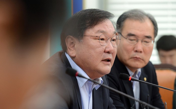 더불어민주당 김태년(왼쪽) 정책위의장이 3일 오전 서울 여의도 국회에서 열린 정책조정회의에 참석해 모두발언을 하고 있다. 이날 김 정책위의장은 "이명박-박근혜 정부때 부동산 관련 각종 규제를 풀어 빌미를 제공했다"며, "자유한국당과 바른정당은 현재 부동산 시장 왜곡 현상에 대해 반성적으로 성찰해보시기를 권하고 싶다"고 말했다. 2017.08.03.