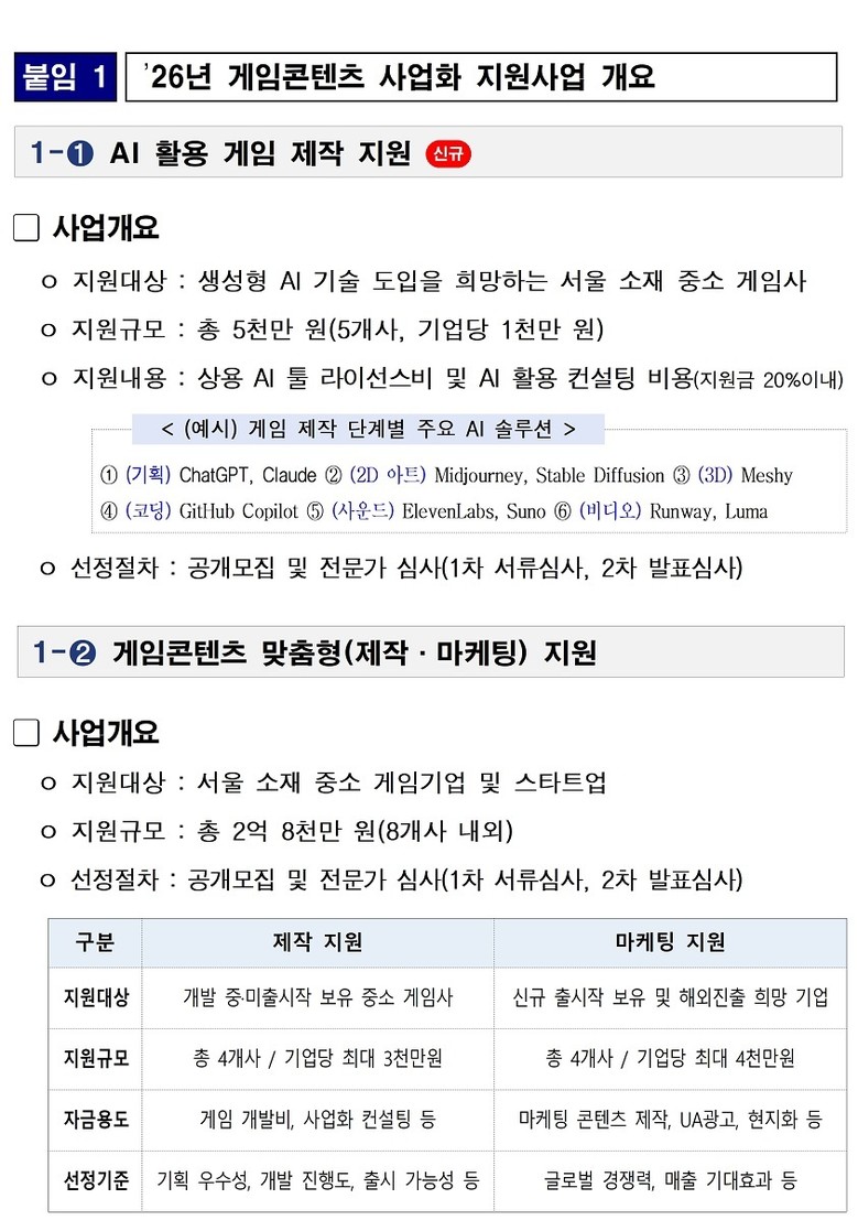 이에 서울시는 이러한 글로벌 기술 트렌드와 산업 환경 변화에 대응해, 중소 게임사의 제작 효율을 높이고 글로벌 경쟁력을 강화하기 위한 ‘2026 게임콘텐츠 사업화 지원사업’을 본격 추진한다고 밝혔다. 이번 사업은 ▴생성형 AI 활용 제작 지원(신규) ▴게임 제작 지원 ▴게임 마케팅 지원 등 3대 분야로 구성된다.