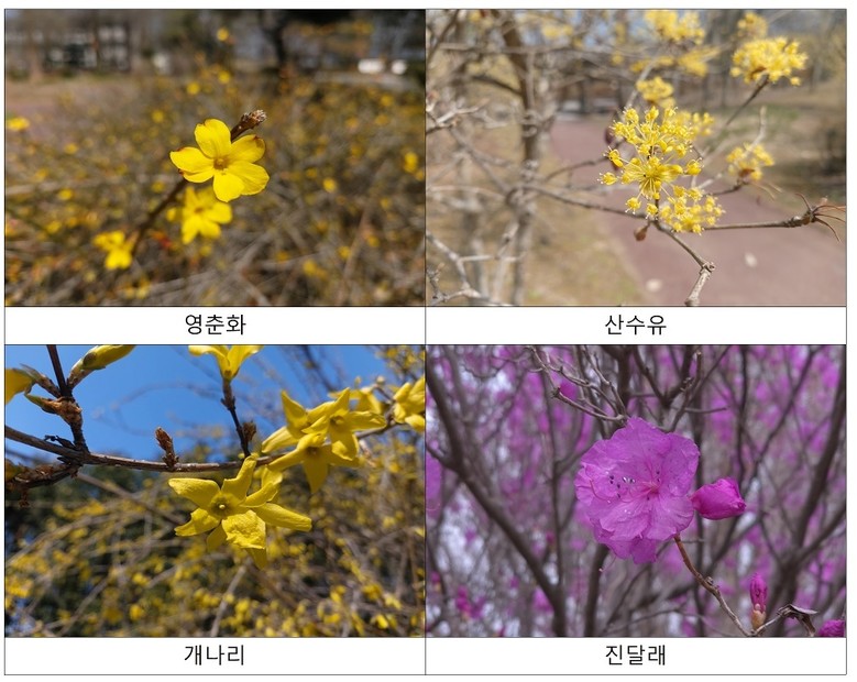 ▸ 미선나무, 히어리, 장수만리화, 깽깽이풀, 목련, 복수초, 영춘화, 산수유, 개나리, 진달래