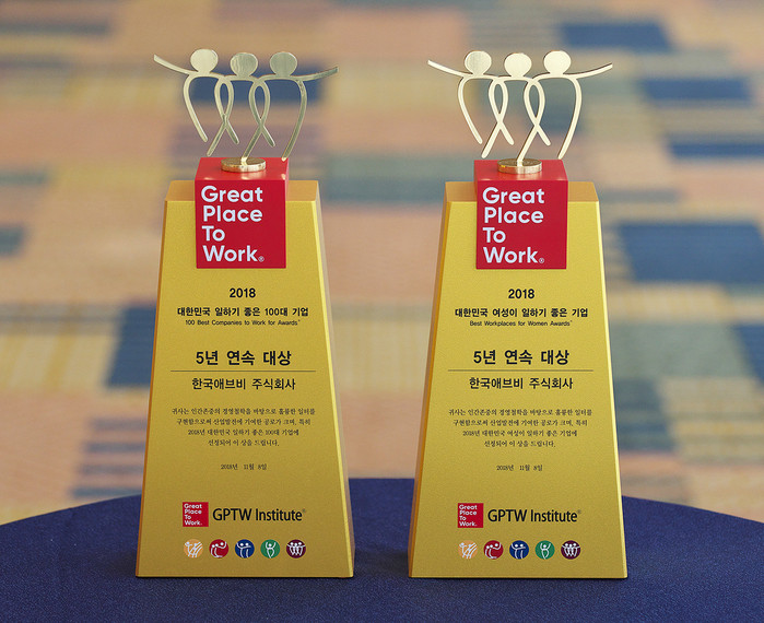 한국애브비는 6년 연속 대한민국 일하기 좋은 기업과 5년 연속 대한민국 여성이 일하기 좋은 기업으로 선정됐고, 제약 기업 중 유일하게 5년 연속으로 두 부문에서 대상을 받은 기업이 됐다. 대표이사 류홍기 사장은 지난 해에 이어 존경받는 CEO에 3년 연속으로 선정됐다. Customer Excellence 부서 피승재 부장은 GPTW 혁신리더로 선정됐다.