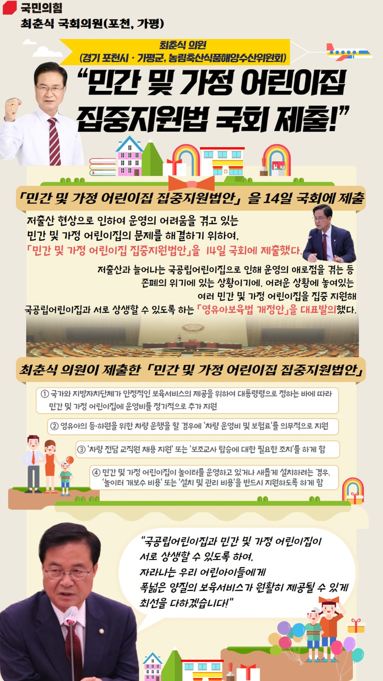 이에 최춘식 의원은 어려운 상황에 놓여있는 여러 민간 및 가정 어린이집을 집중 지원해 국공립어린이집과 서로 상생할 수 있도록 하는 「영유아보육법 개정안」을 대표발의했다.