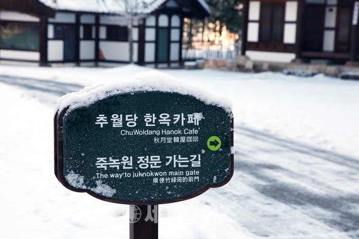 담양 죽녹원 시가문화촌 연못까지 하얀 눈으로 덮이며 이색 장관을 연출하고 있다. 추월당 한옥카페를 지나 소복하게 쌓인 눈으로 흰백의 침대를 연상케 하는 대나무 의자가 보인다. 왠지, 눕기만 하면 금방이라도 잠이 들 것 같다. 우송당 처마 밑에는 애기 고드름이 쪼르륵 매달려 있다.