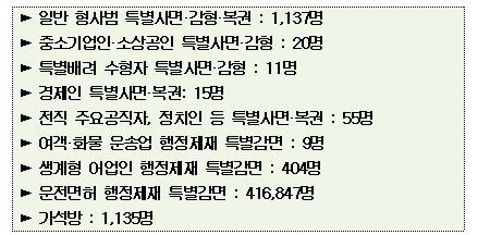 김 전 지사는 친문재인계 적자이자 더불어민주당 이재명 전 대표의 잠재적인 경쟁자로 꼽히는 만큼 복권으로 정치 조기 복귀 여건이 조성되면 상당한 정치적 파장이 일 것이란 관측이 나온다.정부에 비판적인 단체나 예술가를 정부 지원 대상에서 배제하는 이른바 문화계 블랙리스트 사건으로 징역 1년 2개월을 확정받아 복역한 조윤선 전 정무수석도 이번 사면·복권 대상에 포함됐다.보수단체를 불법 지원했다는 이른바 화이트리스트 사건으로 복역한 현기환 전 정무수석, 대기업에 거액의 미르재단·K스포츠재단 출연금을 압박한 혐의로 징역형을 선고받은 뒤 만기 출소한 안종범 전 정책조정수석도 복권됐다.국정원 예산으로 민간인 댓글 부대를 운영하는 등 재직시절 각종 정치 공작을 벌인 혐의로 복역하다 지난해 가석방된 원세훈 전 국정원장도 사면 및 복권됐다.박근혜 정부 때 총선에 개입한 혐의로 유죄를 확정받은 강신명·이철성 전 경찰청장, 이명박 정부 시절 댓글 여론 공작에 관여한 혐의로 유죄를 확정받은 조현오 전 경찰청장과 경찰청 정보·보안국장 등 고위 간부들도 대거 복권 명단에 이름을 올렸다.전직 국회의원 가운데 원유철·엄용수·노철래·염동열·박상은·신학용·권오을·송희경·이군현·홍일표·황주홍·박종희·박준영 전 의원 등 13명도 복권됐다.정재찬 전 공정거래위원장, 권선택 전 대전시장, 이기하 전 오산시장, 김시환 전 청양군수, 유영구 전 명지학원 이사장, 최동열 전 강원랜드 전략기획본부장 등도 복권됐다.경제인 가운데서는 미공개 정보를 통해 차명 계좌로 주식을 샀다가 파는 방식으로 11억여원의 시세차익을 올린 혐의로 지난해 8월 징역 2년형을 확정받은 이동채 전 에코프로 그룹 대표가 사면됐다.정원주 중흥그룹 부회장과 조순구 전 인터엠 대표, 최규옥 전 오스템임플란트 회장도 복권됐다.정부는 여객·화물 운송업, 생계형 어업, 운전면허 등 행정제재 대상자 총 41만7천260명에 대한 특별감면 조치를 실시하기로 했다.사면 효력은 15일 오전 0시부터 발생한다.