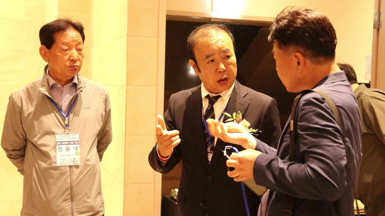 ▲토지등소유자와 이야기를 나누고 있는 홍성열 조합장(중앙) 정용태 감사(왼쪽