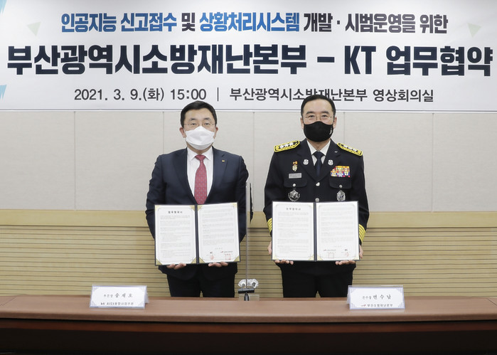 [세계타임즈 이영진 기자]KT가 9일 부산소방재난본부와 ‘인공지능(AI) 119신고접수시스템 개발과 시범운영’을 위한 업무협약을 체결했다고 10일 밝혔다. 이날 협약식에는 송재호 KT AI/DX융합사업부문장과 변수남 부산소방재난 본부장이 참석했다.