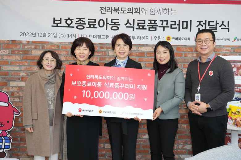 [전북세계타임즈 = 전영숙 기자] 전라북도의회(의장 국주영은)는 21일 보호 종료 아동 식자재 지원을 위해 세이브더칠드런 서부지역본부에 성금 1천만 원을 전달했다.