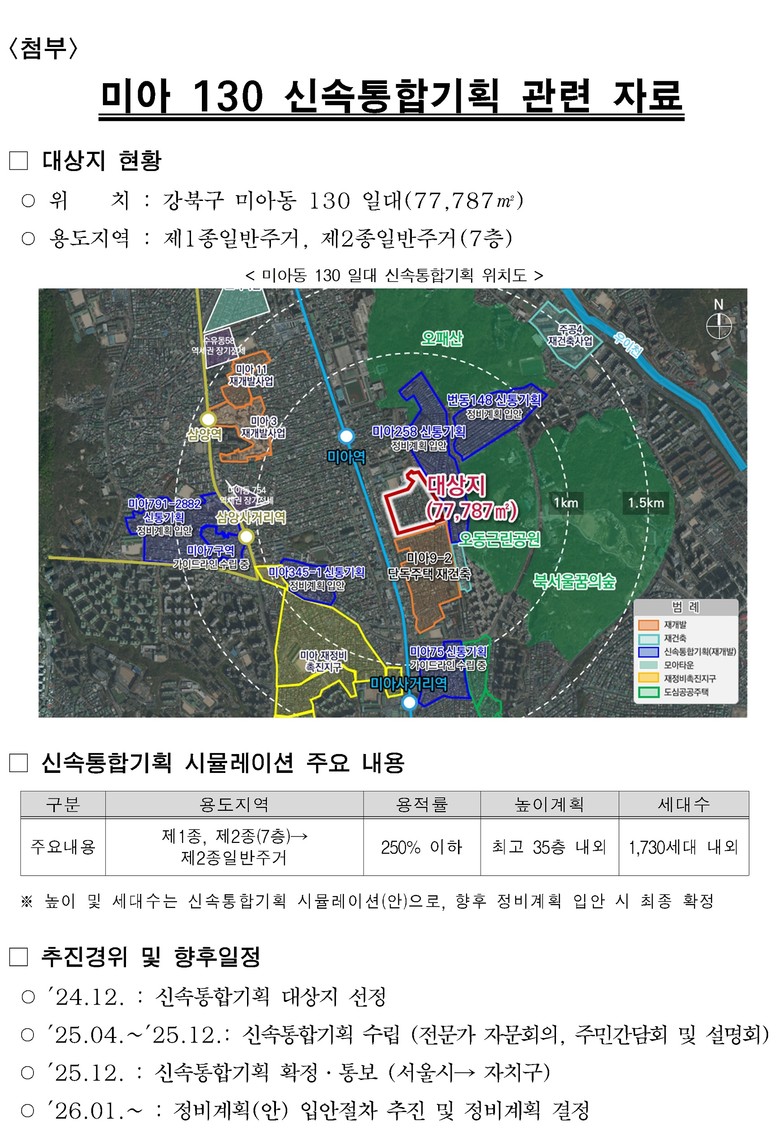 이번 미아동 130 일대 재개발 신속통합기획이 확정됨에 따라 서울시 내 대상지 총 249개소 중 152개소(약 25.7만호)의 신속통합기획이 마무리됐다.