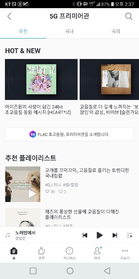 지니가 새롭게 선보이는 ‘5G 프리미어관’은 원음에 가까운 FLAC(Free Lossless Audio Codec, 플락) 24bit(비트) 음원을 즐길 수 있는 초고음질 전용관이다. FLAC 16bit가 CD급 원음이라면 FLAC 24bit 음원은 소리를 원음에 가깝도록 더 세밀하게 구현한 ‘스튜디오 원음’으로 일컬어진다.