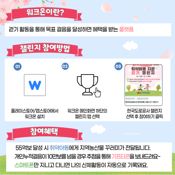 [세계타임즈 손권일 기자]한국도로공사(사장 김진숙)는 ESG 경영의 일환으로 4월 1일(금)부터 30일(토)까지 취약계층 아동 지원을 위해 전 국민이 함께하는 ‘55억보 걷기 챌린지’를 실시한다고 밝혔다.