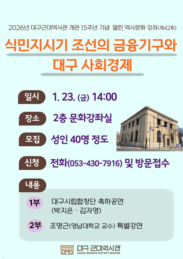 세부 프로그램을 살펴보면, 먼저 1월 23일(금) 오후 2시에는 제42회 열린 역사문화 강좌를 개최한다. 특강은 ‘식민지시기 조선의 금융기구와 대구 사회 경제’를 주제로 조명근 영남대 교수가 진행한다. 조명근 교수는 근대 경제사 전문가로, 강의는 조선식산은행을 비롯한 근대 금융기구를 통해 식민지 조선과 대구 사회·경제에 대해 폭넓게 이해하는 시간이 될 것으로 기대된다. 성인 40명을 선착순 모집하며, 참여를 희망하는 사람은 전화(053-430-7916) 또는 대구근대역사관을 방문해 신청하면 된다. 잔여석이 있는 경우 당일 현장 접수도 가능하다.