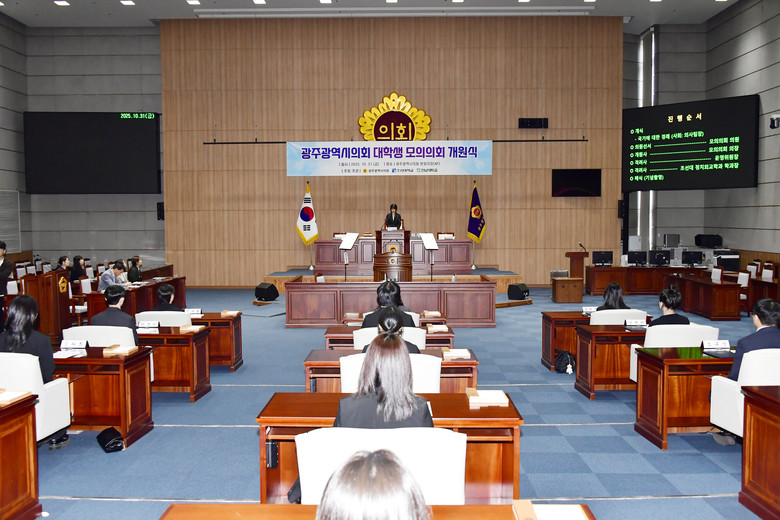 시의회 본회의장에서 개최된 개원식에는 30여 명의 대학생 모의의회 의원들과 정다은 의회운영위원장, 강수정 조선대학교 정치외교학과장 등이 참석했다.