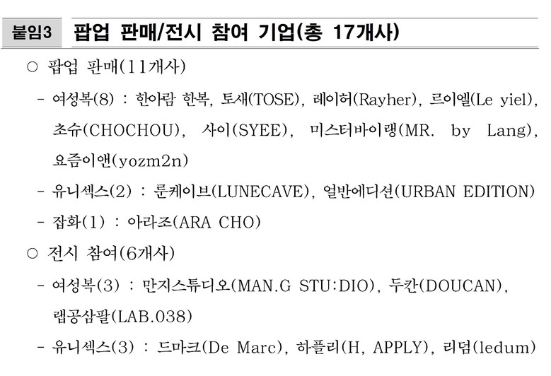 ※ 팝업 판매・전시 참여 17개사 붙임 참조