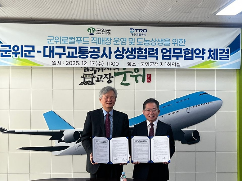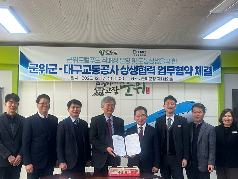 대구교통공사는 지역 농산물 소비 촉진과 도농 상생협력 강화를 위해 군위군과 협력해 1호선 대구역 지하 2층 대합실에 농산물 직매장을 조성·운영하기로 합의하고, 지난 12월 17일(수) 군위군청에서 ‘군위 로컬푸드 직매장 운영을 위한 업무협약(MOU)’를 체결했다. 이번 협약은 지난 7월부터 양 기관이 수차례 현장 실사와 협의를 거쳐 추진된 결과다.