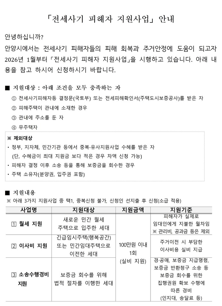 지원 대상은 전세사기피해자등 결정문(국토부) 또는 전세피해확인서(주택도시보증공사)를 받은 무주택자로, 피해 주택이 안양시에 소재하고 신청일 기준 안양시에 주민등록을 둔 시민이다.