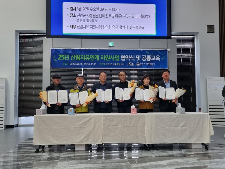 [세계타임즈=진안군 김서주 기자] 26일 진안군 진안읍 사통팔달센터에서는 ‘2025 산림치유연계 지원사업’협약식이 개최됐다.