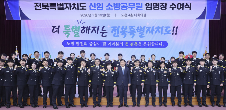 ○ 가족·친지 함께한 임명장 수여식…따뜻한 축하 속 첫 출발 [세계타임즈=전북 이상호 기자] 전북특별자치도는 19일 도청 4층 대회의실에서 2026년 신임 소방공무원 임명장 수여식을 열고, 도민의 생명과 안전을 지킬 신임 소방공무원 45명을 공식 임명했다.