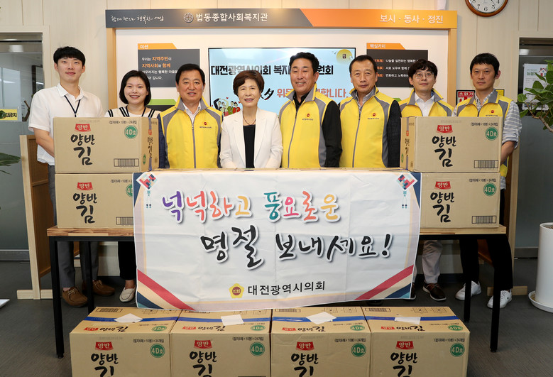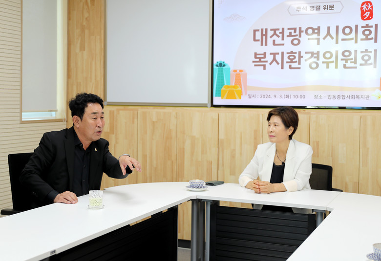 [대전 세계타임즈=이채봉 기자] 대전시의회 복지환경위원회(위원장 이효성)는 민족 최대의 명절인 추석을 앞두고 대덕구 법동에 위치한 법동종합사회복지관(관장 김성자)를 방문해, ‘함께 나누고.함께 일하고.함께 노력하는 사회복지서비스 제공을 통해 지역공동체적인 삶을 실천’하고 있는 직원들을 격려하고 위문품을 전달하는 등 위로와 격려의 시간을 가졌다.