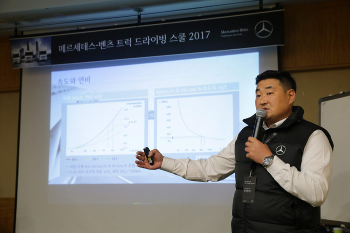 이론 교육에 이어 진행된 2교시 1:1 주행 실습 교육에서는 실제 고객들의 차량으로 다임러 트럭 코리아의 전문 트레이너가 동승하여 오크벨리 리조트에서 횡성 IC까지 오르막, 내리막길이 반복되는 고속도로와 국도로 구성된 구간을 주행하는 코스에서 각 지점의 특성과 지형에 따라 크루즈 컨트롤 및 에코롤 기능, 고성능 엔진 브레이크 및 워터 리타더 등 혁신적인 보조 제동 장치를 활용하여 주행하는 트레이닝이 진행되었다.