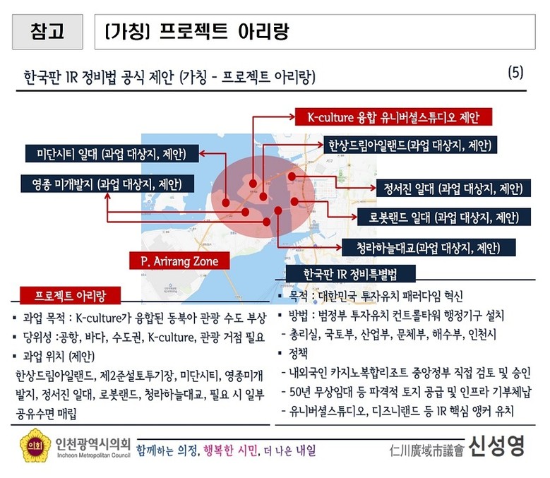 이어 신 의원은 영종의 잠재력을 극대화하기 위한 중장기 전략으로 ‘프로젝트 아리랑’을 제안했다.