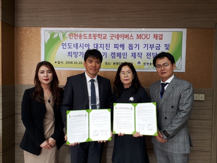 인천송도초등학교 모미정 교장은 “이번 협약을 통해 아이들에게 더 많은 교육 프로그램을 제공하고 서로 협력할 수 있는 좋은 기회가 된 것 같으며, 인천송도초등학교 학생들이 지진으로 고통 받는 인도네시아 주민들을 위해 모금한 성금이 인도네시아 주민들에게 힘이 되기를 바란다.”고 이야기했다.