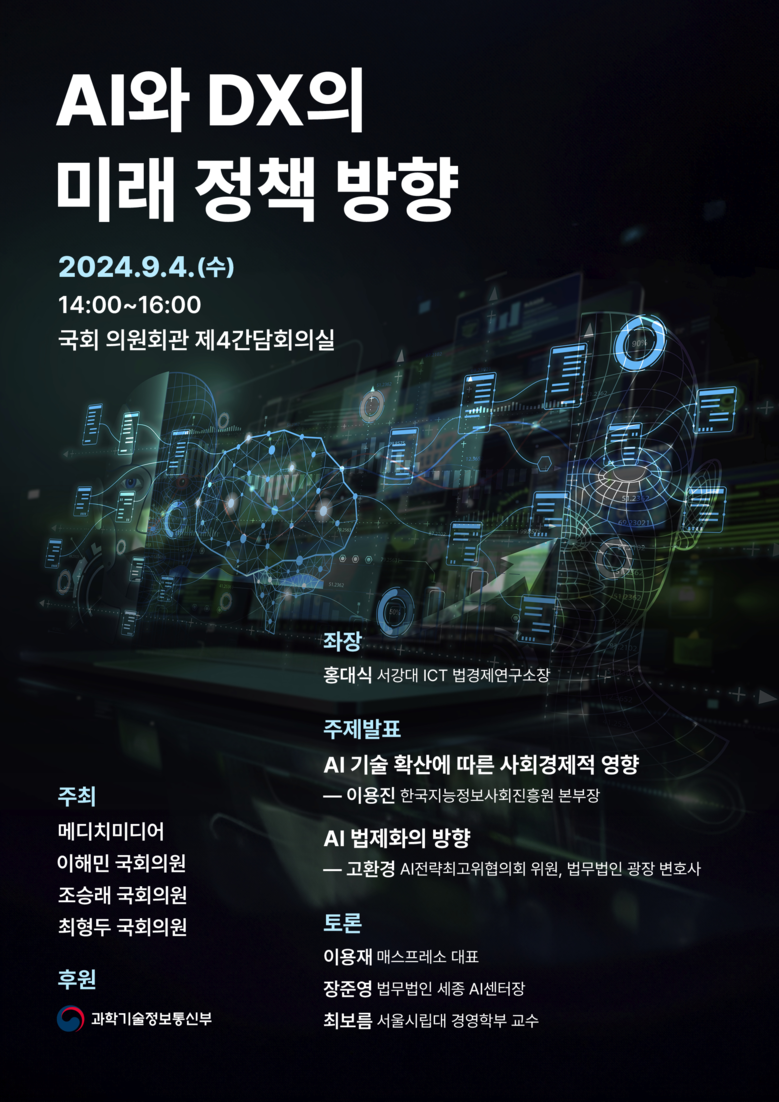 오는 9 월 4 일 오후 2 시 국회의원회관 제 4 간담회의실에서 "AI 와 디지털 전환 (DX) 의 미래 정책 방향 " 을 주제로 하는 포럼이 개최된다 . 포럼은 AI 확산의 사회경제적 변화와 법제화의 중요성을 중점적으로 다룬다 .