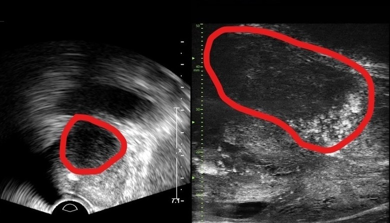▲기존 전립선 초음파 사진(좌) 및 마이크로 초음파 사진(우). 기존 초음파는 전립선 부위(동그라미 친 부분)의 음영 차이로만 병변을 확인했지만, 마이크로 초음파는 높은 해상도를 통해 종양과 주변 조직의 모양까지 확인가능하다.(사진=분당서울대병원)