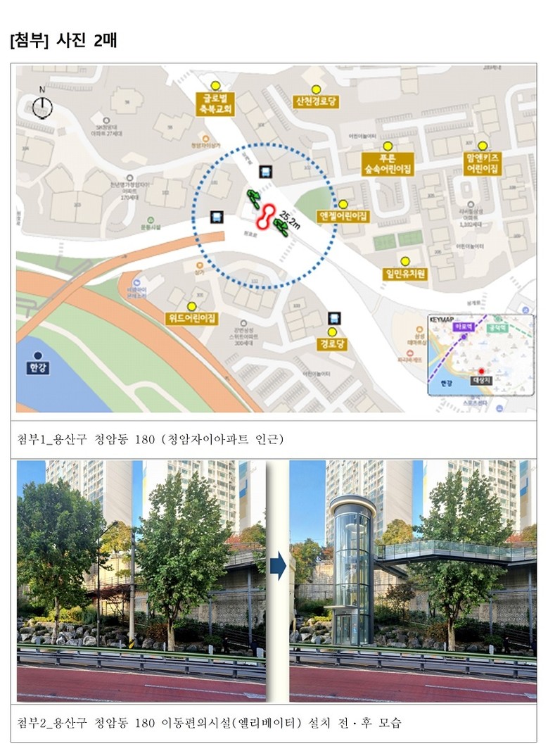 김 의원은 “이번 사업은 단순한 시설 설치를 넘어, 고지대 주민들의 일상적인 이동권을 보장하는 생활SOC 확충이라는 점에서 의미가 크다”며 “엘리베이터가 설치되면 인근 1,500여 세대 주민들이 대중교통 이용과 통학시, 한강공원과 상가시설 이용 등 생활편의시설 접근 시 보다 안전하고 편리한 환경을 누리게 될 것”이라고 강조했다.