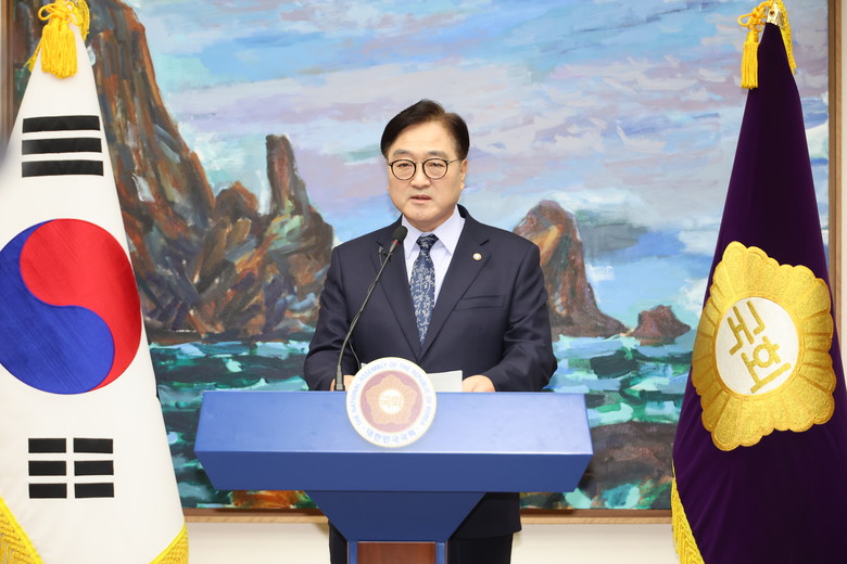 우원식 국회의장이 8일 오후 서울 여의도 국회에서 긴급 기자회견을 열어 한덕수 국무총리와 국민의힘 한동훈 대표의 공동 대국민 담화와 관련해 입장을 밝히고 있다. 2024.12.8