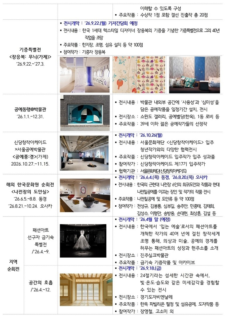 한편 서울공예박물관은 지난해 55만 명 이상의 전시 관람객과 평균 만족도 94% 이상을 기록하며 공예 전문 박물관으로서 위상을 공고히 했다. 2026년은 이러한 성과를 바탕으로, 다양한 전시를 통해 서울의 역사와 시민의 삶, 세계를 향한 K-공예의 가치를 선보일 계획이다.