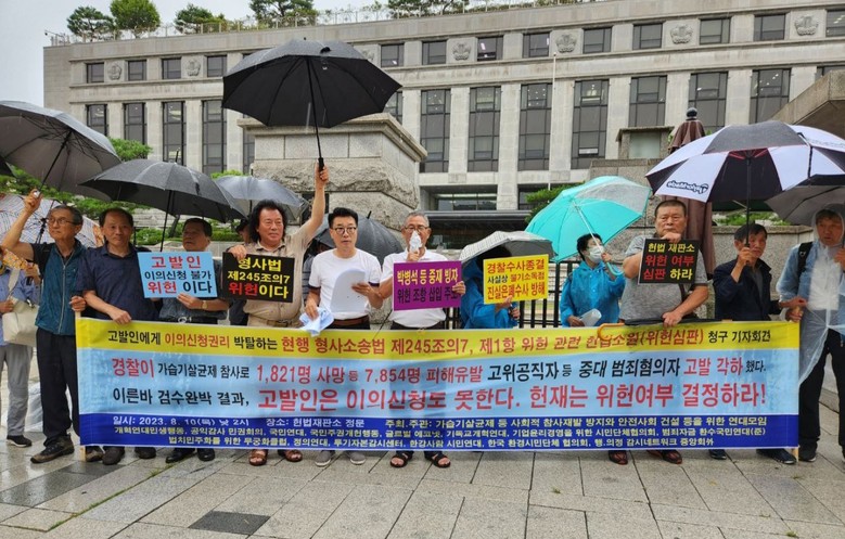 [세계타임즈 백진욱 기자] 어제(8.10. 목) 낮 2시부터 약 30분 동안 종로구 계동에 있는 헌법재판소 정문 앞에서 강한 비바람이 몰아치는 날씨에도 ‘가습기살균제 등 사회적 참사재발 방지와 안전사회 건설 등을 위한 연대모임’(약칭: 안전사회건설연대모임) 등 총 17개 시민환경단체 대표와 회원 등 약 20여명이 현행 형사소송법 제245조의7 제1항이 고발인으로부터 이의신청권리를 박탈하는 위헌임을 확인해달라고 청구하는 헌법소원 제기하는 기자회견을 열었다.