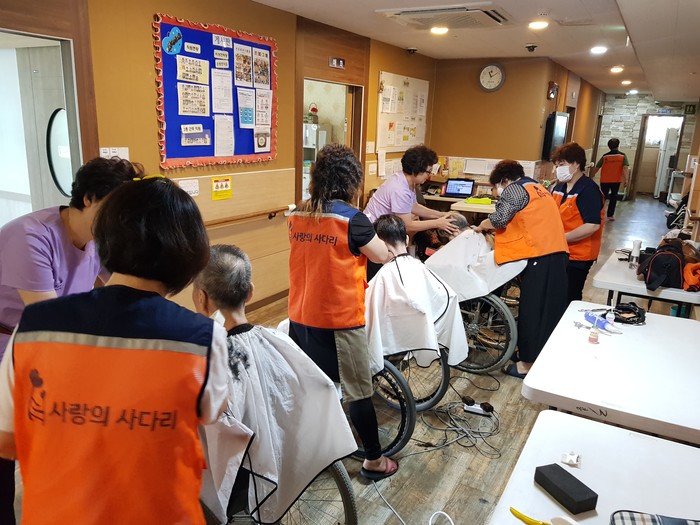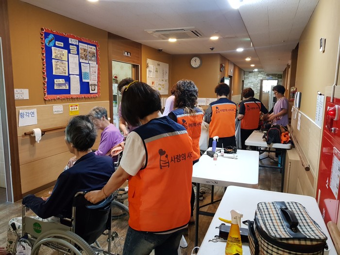 이날 미용봉사는 송남석 단장을 비롯해서 김미경, 이미향, 이하영, 조은숙, 조인숙 가위천사들이 별관, 2층, 3층에서 치매 및 와상 어르신들 40명께 미용봉사를 하였다.