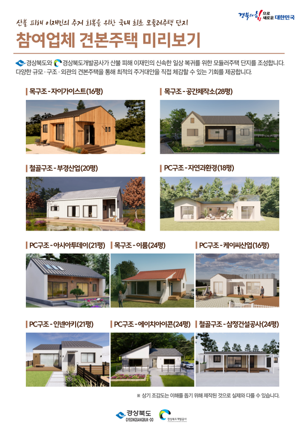 배용수 경북도 건설도시국장은 “모듈러 견본주택 단지 조성으로 산불 피해지역 주민의 주거 회복을 지원하고 견본주택 5호 정도를 추가 설치해 실수요자에게도 다양한 주거 형태를 제공할 계획이다”고 밝혔다.