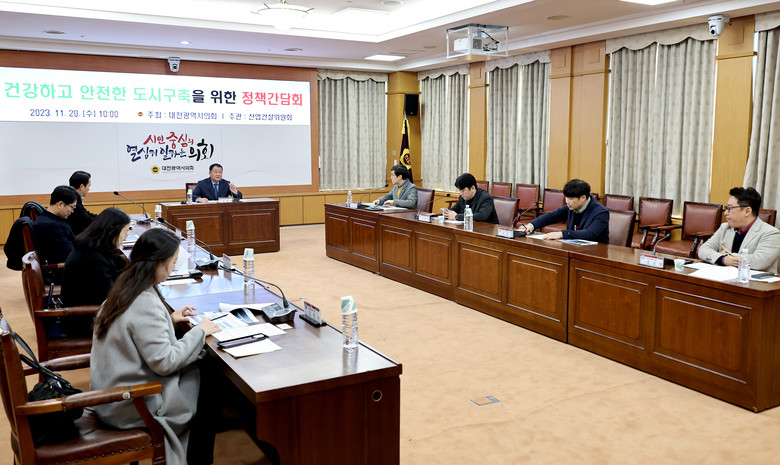 [대전 세계타임즈=이채봉 기자] 대전시의회 산업건설위원회는 송대윤 의원(더불어민주당, 유성구2) 주재로 29일 오전 10시 3층 소통실에서 ‘건강하고 안전한 도시 구축을 위한 정책간담회’를 개최했다.