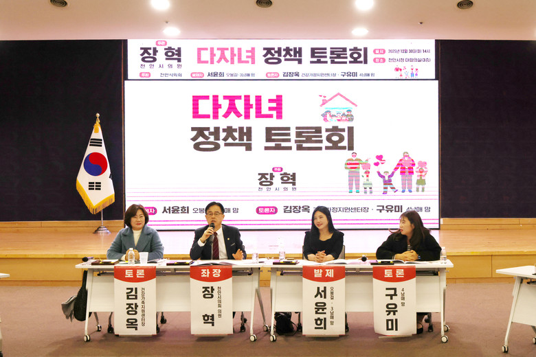 토론회를 주관한 장혁 천안시의원은 “다자녀 정책은 단순한 출산 장려가 아니라, 아이를 키우는 시민의 일상을 지키는 생활정책”이라며 “오늘 제시된 현장의 목소리와 제안을 정리해 시 집행부와 후속 협의를 이어가고, 의회 차원에서 가능한 과제는 조례와 정책 제안으로 연결하겠다”고 밝혔다.