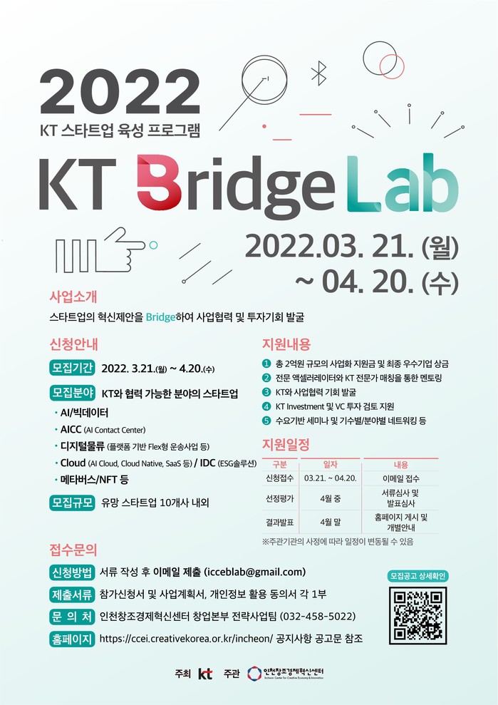 ‘KT Bridge Lab 1기’는 오는 5월 발대식을 시작으로 10월까지 액셀러레이팅을 진행하며, 파이널 ‘피칭데이’에서는 IR 및 사업화 제안 발표회를 통해 최종 우수기업들을 시상한다. 사업화지원금 및 상금은 총 2억원 규모로 지원할 계획이다.