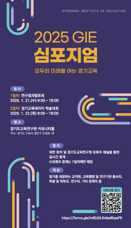 (재)경기도교육연구원에서는 매년 GIE 심포지엄이라는 이름으로 한해 동안 수행한 연구결과와 교육데이터를 활용한 학술논문을 발표하는 자리를 마련하고 있다. 경기도교육연구원은 2025년 총 74편의 연구를 수행하였으며 이번 학술대회를 위해 경기교육종단연구, 경기학교교육실태조사 외에 경기기초학력종단연구 데이터를 새롭게 배포했다.